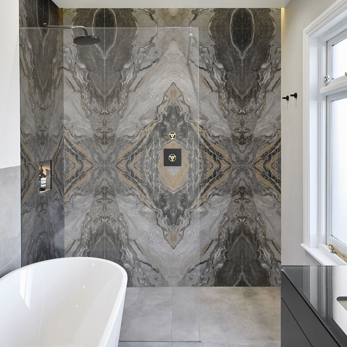 The Magnifique range of premium high gloss marble effect porcelain tiles creates a stunning focal point with this timeless design. There are a range of striking layouts, with three shade options in bookmatched sets. They are suitable for use on interior walls and the A and B that make up the bookmatched pattern are sold separately.